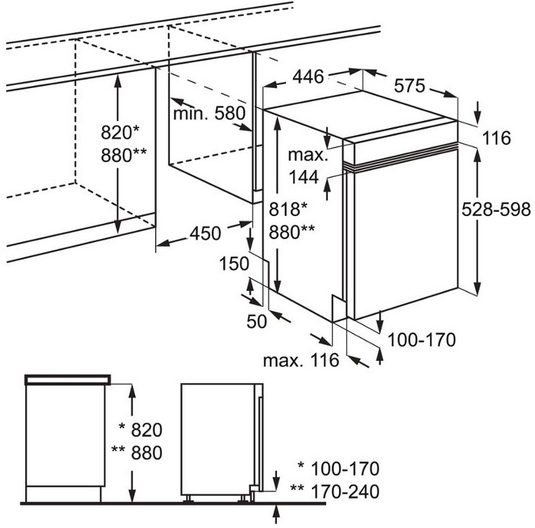 S rozměry 81,8 × 44,6 × 57 cm je vestavná myčka ideální pro malé i velké kuchyně. Své využití najde také na chatách a chalupách. Přesné rozměry pro instalaci poskytne nákres, který je součástí balení. Celková hmotnost myčky je 38,33 kg.